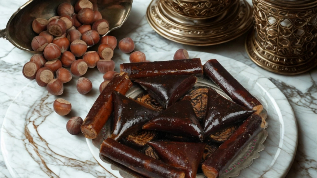 içindekiler: dut şırası, pekmez, süt, un, bal, pudra şekeri, çeşidene göre fındık, badem, ceviz, antep fıstığı, yerfıstığı kadayıf, hindistan cevizi ve nişasta içerir.